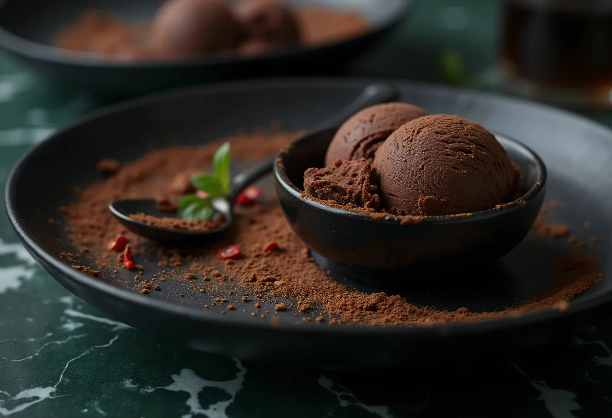 Návrat ku koreňom: aztécky 'xocolatl' nebol sladkou mliečnou čokoládou, ale korenistým, horkým nápojom. Tento sorbet evokuje túto prastarú tradíciu v modernej podobe. Obsah kapsaicínu v čili vyvoláva v ústach pocit tepla, čo je v vzrušujúcom kontraste s ľadovým chladom sorbetu. Najprv ucítiš hĺbku čokolády a v hrdle potom príjemnú, hrejivú dochuť čili.