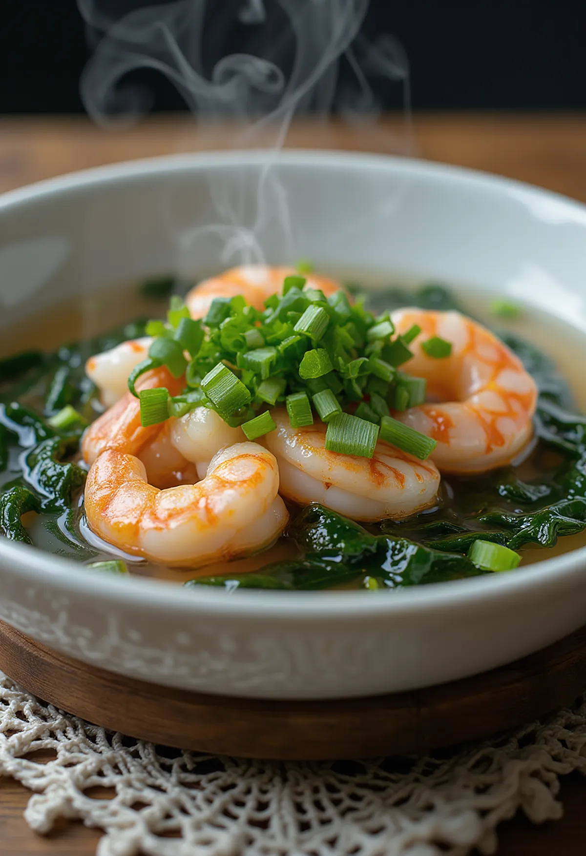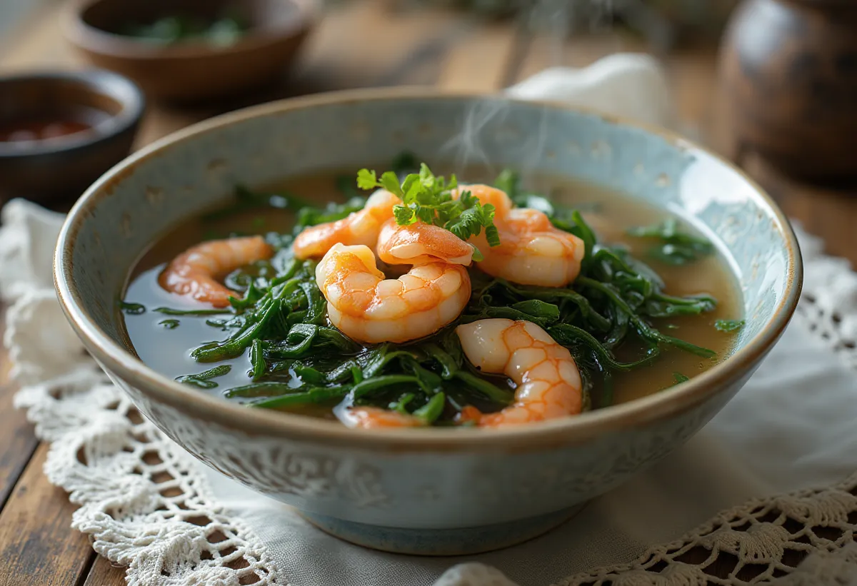 Miyeokguk, teda kórejská polievka z morských rias, je neodmysliteľným jedlom narodenín – symbolom dlhého života. Hoci sa často pripravuje s hovädzím mäsom, táto krabia verzia je ľahšia a do popredia stavia morské chute. Hodvábna textúra riasy wakame (miyeok) a pražená aróma sezamového oleja vytvárajú hlbokú, upokojujúcu chuť (umami), ktorá zahreje už po prvej lyžičke.